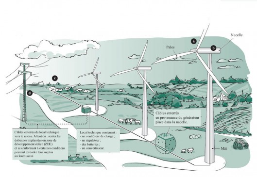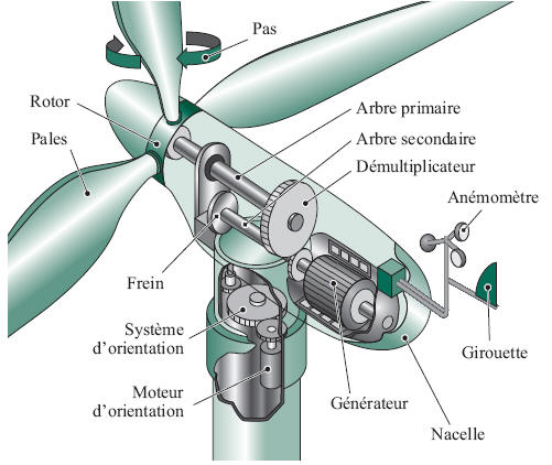 - Dans votre cahier, expliquer le fonctionnement de l'éolienne en utilisant le nom précis de chaque pièce.