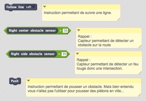 Trois niveaux de difficultés : -1- Peut importe les moyens, vous réalisez l'exercice en symbolisant les déplacements des voitures. (petit niveau 5ème). Pas besoin de rédiger l'algorithme. -2- Vous vous aidez de la détection des couleurs pour tourner dans le bon sens et au bon moment. (petit niveau 4ème). Rédigez l'algorithme à l'écrit sur le cahier. -3- Vous comptez les intersections pour tourner au bon moment. (niveau troisième ). Rédigez l'algorithme à l'écrit sur le cahier et lisez l'aide ci-dessous. |