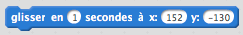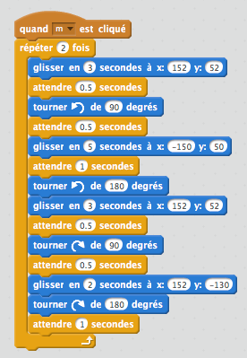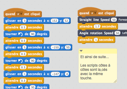 Quand a est cliqué, - Si la couleur orange est touchée, - Alors donner la valeur 0 en X et Y au robot. (il va au centre) - Sinon glisser en 3s au point (152x;52y) -3- Si on supprime la dernière brique de rotation (à 180 °). Que se passera-t-il lors du second parcours du robot (deuxème répétition de la boucle) ? |