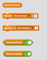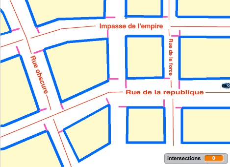 Trois niveaux de difficultés : -1- Peut importe les moyens, vous réalisez l'exercice en symbolisant les déplacements des voitures. (petit niveau 5ème). Pas besoin de rédiger l'algorithme. -2- Vous vous aidez de la détection des couleurs pour tourner dans le bon sens et au bon moment. (petit niveau 4ème). Rédigez l'algorithme à l'écrit sur le cahier. -3- Vous comptez les intersections pour tourner au bon moment. (niveau troisième ). Rédigez l'algorithme à l'écrit sur le cahier et lisez l'aide ci-dessous. |